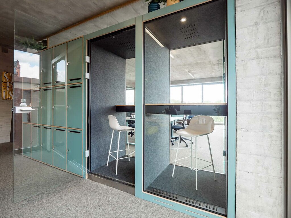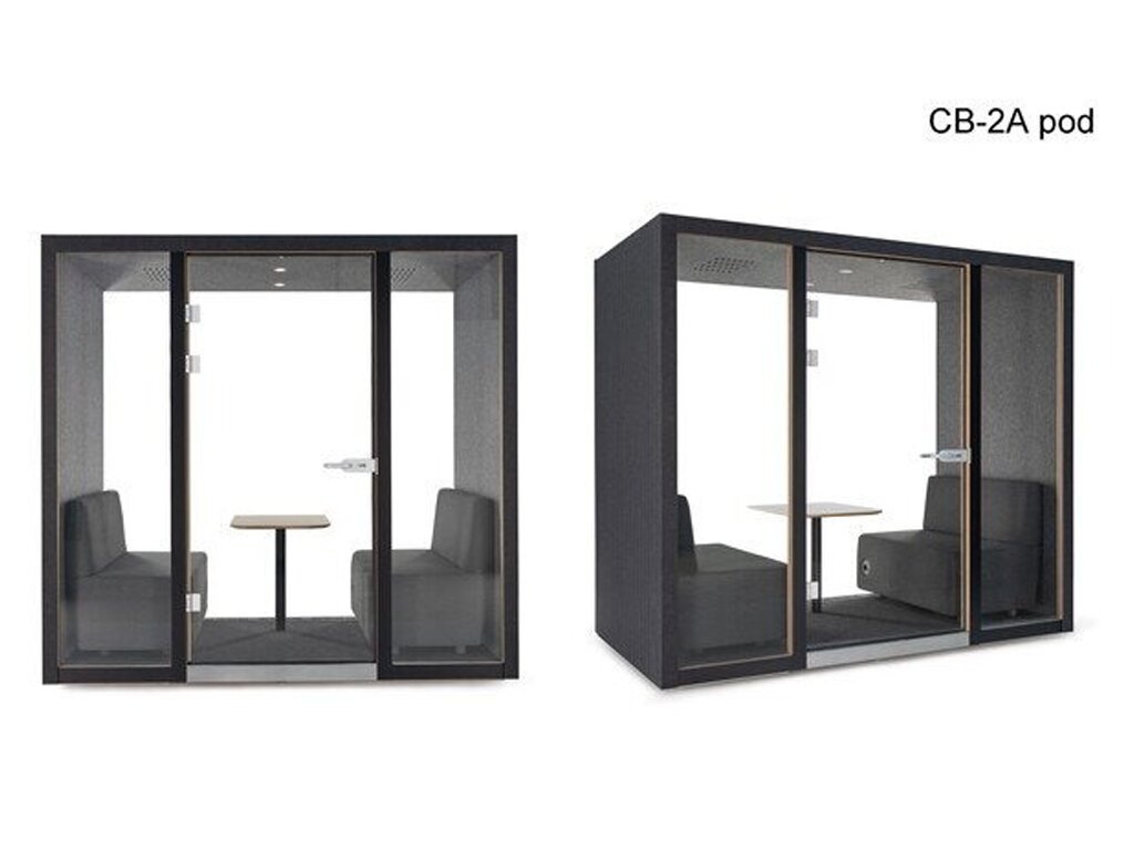 CO-BOOTH A, an individual pod, Provides a comfortable acoustic space for one person to make personal calls, attend conference calls or work for a short period of time, with a wall-mounted table and a seat. Integrated power supply, LED lighting and ventilation ensure a comfortable an acoustic environment.