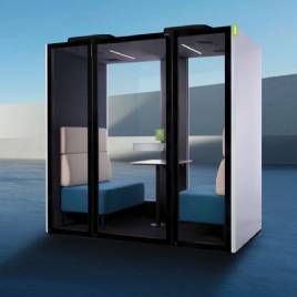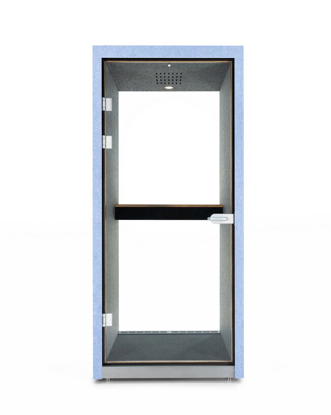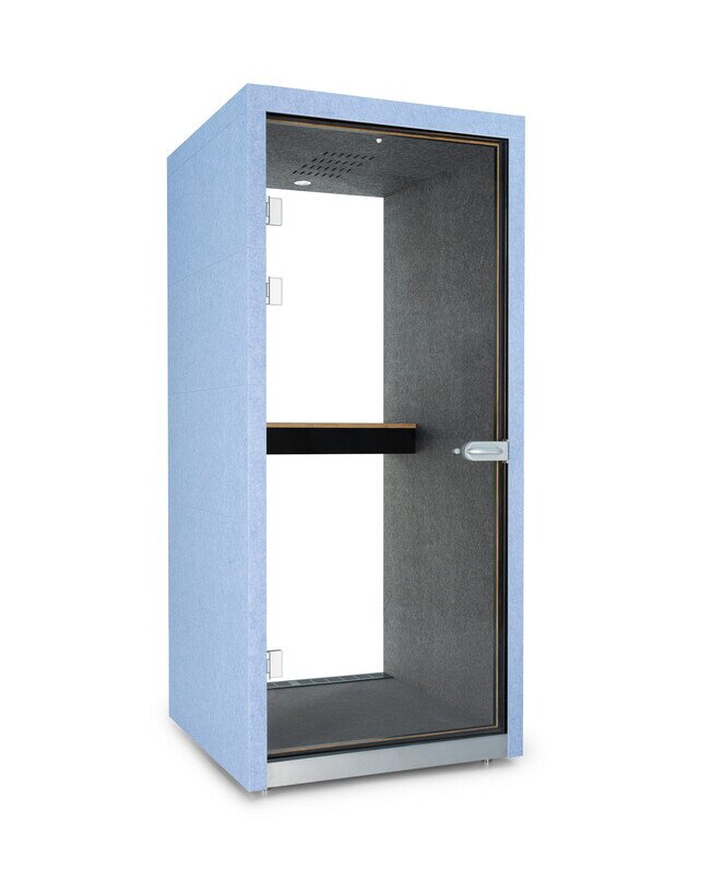 CO-BOOTH A, an individual pod, Provides a comfortable acoustic space for one person to make personal calls, attend conference calls or work for a short period of time, with a wall-mounted table and a seat. Integrated power supply, LED lighting and ventilation ensure a comfortable an acoustic environment.