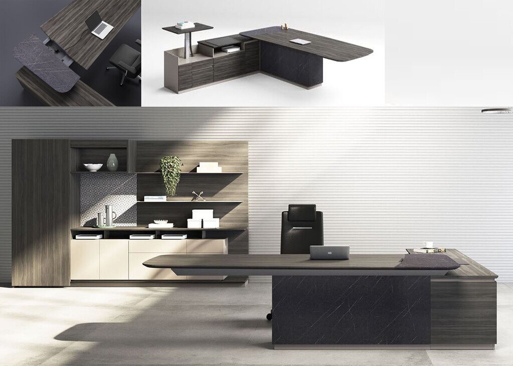 The desk top of HORI is furnished in wood veneer and marble pattern, together with streamlined edging, rounded corner design. and a sliding function on the side to hide all the sockets and wires.